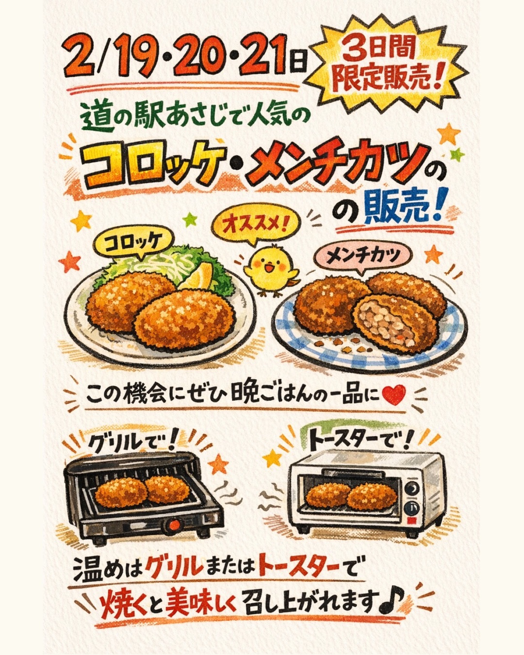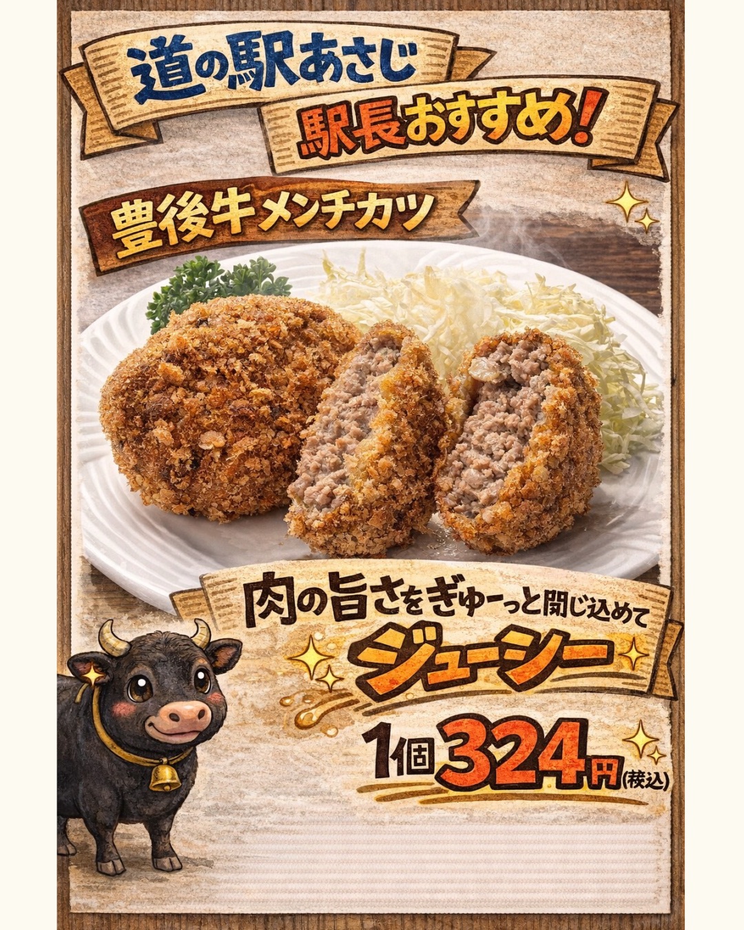 【お知らせ- ̗̀】朝地コロッケと 豊後牛メンチカツを揚げたてで!トキハ本店B2F 公開済み: 2026年2月14日更新: 2026年2月14日作成者: Masajiカテゴリー: お知らせ, ブログタグ: コロッケ, メンチカツ, 豊後牛 トキハ本店B2Fにて道の駅あさじの、朝地コロッケと 豊後牛メンチカツを揚げたてで販売します!! 期間は2月19日~21日の3日間になります 道の駅あさじ人気No.1の朝地コロッケは、豊後牛入り♪ ジューシーな豊後牛メンチカツは駅長オススメの一品です! 小腹が空いた時のおやつにも、 ご飯のおかずにもおすすめですよー 時間は10:00-17:00までになります ̖́- 皆様のお越しをお待ちしております♪ 関連記事 年末年始の営業日のお知らせ 2025年~2026年 […] 公開済み: 2025年12月18日更新: 2025年12月18日作成者: Masajiカテゴリー: お知らせ, ブログタグ: 年末年始 スイートコーン入荷!フルーツサンドも好評発売中 […] 公開済み: 2021年7月3日更新: 2021年7月26日作成者: Masajiカテゴリー: お知らせ, ブログ 16 焼きとうもろこし […] 公開済み: 2022年7月16日更新: 2022年7月17日作成者: Masajiカテゴリー: お知らせ, ブログ