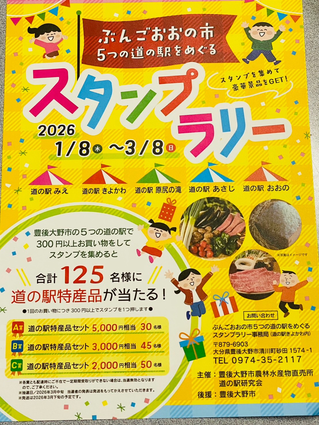 スタンプラリーは 3/8終了!抽選して当選決定! 公開済み: 2026年3月11日更新: 2026年3月12日作成者: Masajiカテゴリー: お知らせ, ブログ, 特産品紹介 道の駅あさじです 1/8からスタートしたスタンプラリーは 3/8をもちまして終了いたしました 沢山のご応募ありがとうございました! 先日、豊後大野市5駅の駅長で抽選会を行いました 当選された125名の方おめでとうございます!! 3/25日までに、各道の駅の特産品をお届けいたします 道の駅あさじからは、A、B、C賞全て 朝地牛をお送りさせていただきます お届けまでもうしばらくお待ちくださいませ 関連記事 おおいた豊後牛 朝地 牛めしの素 […] 公開済み: 2019年2月4日更新: 2019年2月4日作成者: Masajiカテゴリー: お知らせ, ブログ, 特産品紹介タグ: おおいた豊後牛, 九州, 大分県, 朝地牛, 牛めしの素 02 道の駅王子 in 大分県 […] 公開済み: 2023年5月2日更新: 2023年5月2日作成者: Masajiカテゴリー: お知らせ, ブログ, 特産品紹介 新米まつり 2021 道の駅あさじ […] 公開済み: 2021年9月14日更新: 2021年9月14日作成者: Masajiカテゴリー: お知らせ, ブログ, 特産品紹介