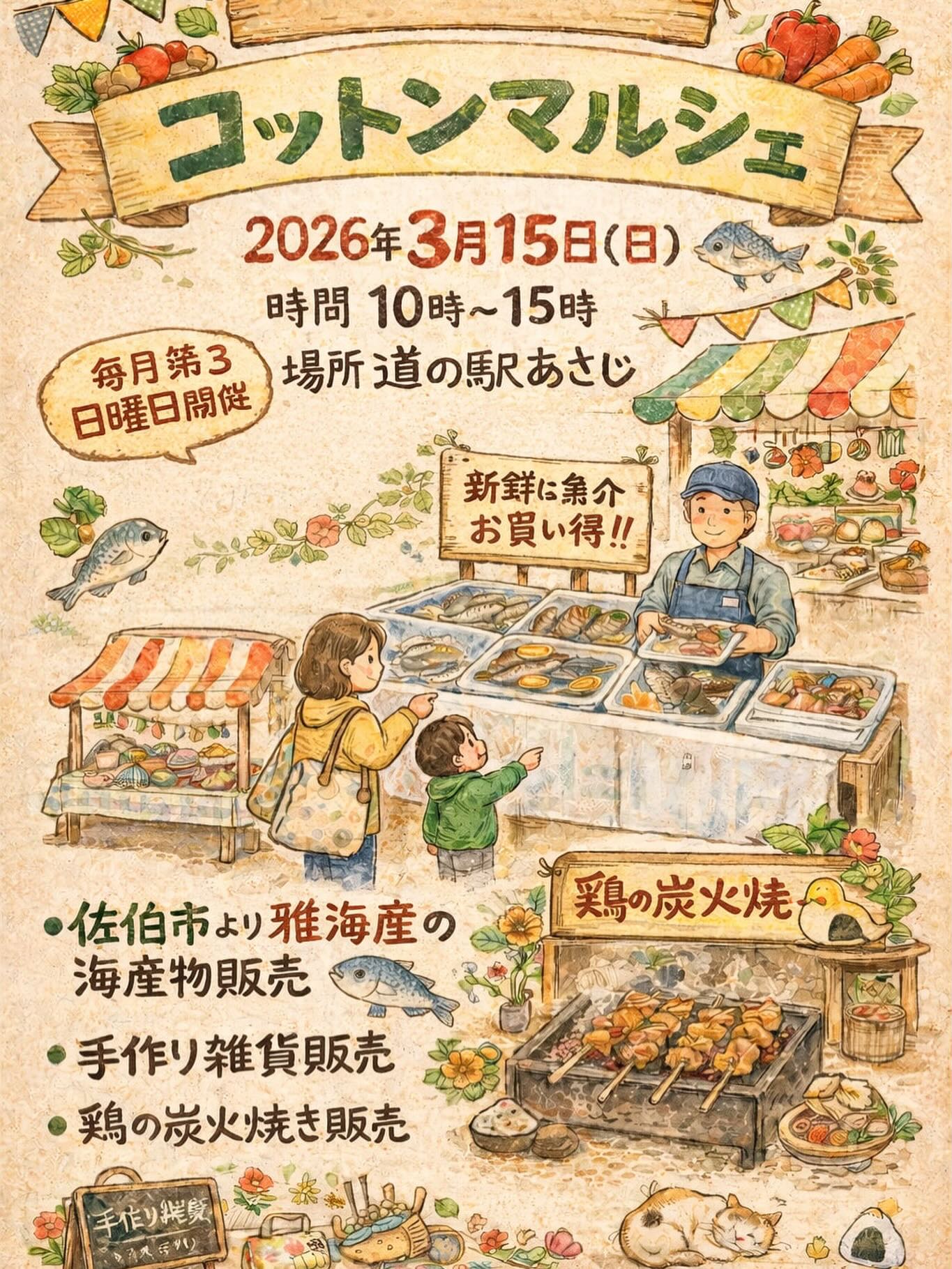 楽しいハンドメイド作家さんの作品や 海産物や鶏の炭火焼の販売も 公開済み: 2026年3月15日更新: 2026年3月15日作成者: Masajiカテゴリー: お知らせ, ブログ, 特産品紹介 マルシェのお知らせ- ̗̀ 道の駅あさじです 3月15日(日) 10:00-15:00 本日、道の駅あさじにてコットン・マルシェです ハンドメイド作家さんの作品や 海産物や鶏の炭火焼の販売も 手作り雑貨は一点物です お気に入りの一品に出会えるかもしれません♡ コットン・マルシェは毎月第3日曜日に 道の駅あさじにて開催されています 皆様ぜひ遊びに来てくださいね 関連記事 02 道の駅王子 in 大分県 […] 公開済み: 2023年5月2日更新: 2023年5月2日作成者: Masajiカテゴリー: お知らせ, ブログ, 特産品紹介 大分トキハ本店にて道の駅あさじの 朝地コロッケと豊後牛メンチカツ […] 公開済み: 2026年2月21日更新: 2026年2月21日作成者: Masajiカテゴリー: お知らせ, ブログ, 特産品紹介 道の駅あさじ秋まつり 2021 神楽 かぐら 11月14日(日)2021年 […] 公開済み: 2021年10月19日更新: 2021年10月19日作成者: Masajiカテゴリー: お知らせ, ブログ, 特産品紹介