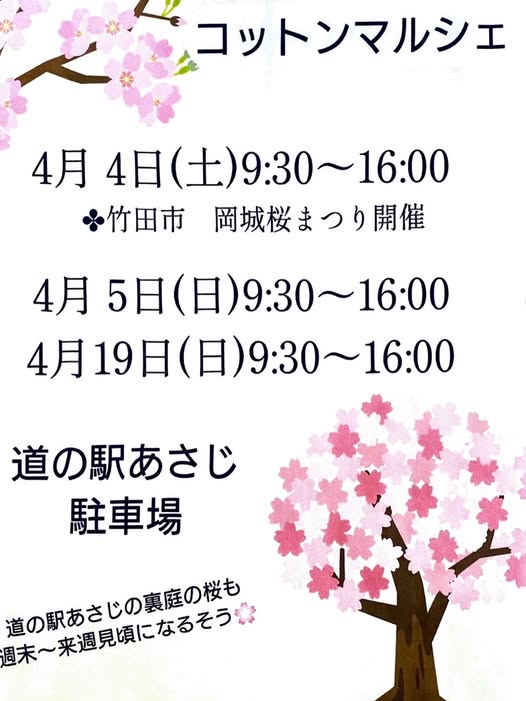 【マルシェのお知らせ- ̗̀ 📢】 公開済み: 2026年4月2日更新: 2026年4月2日作成者: Masajiカテゴリー: お知らせ, ブログ, 特産品紹介 道の駅あさじでは、 定期的にマルシェを開催しております😊⛺️ 毎月第1・第3日曜日に開催されるのが angel.quilts_photoさん主催のコットン・マルシェ✨️ ハンドメイド作家さんのオシャレな作品や 日によってキッチンカーやお菓子屋さんなども 出店されます🚚🍪 週末お天気が心配ですが、、、 桜も見頃を迎えていますので ぜひ遊びに来てください😊🌸 皆様のお越しを心よりお待ちしております❣️ タグ:お出かけ, お花見, キッチンカー, コットン・マルシェ, スイーツ, ハンドメイド, マルシェ, 地域活性化, 大分県, 朝地町, 桜, 豊後大野市, 週末イベント, 道の駅あさじ, 道の駅イベント 関連記事 23 トウモロコシ、桃が初入荷! […] 公開済み: 2021年6月23日更新: 2021年6月23日作成者: Masajiカテゴリー: お知らせ, ブログ, 特産品紹介 15 楽しいハンドメイド作家さんの作品や 海産物や鶏の炭火焼の販売も […] 公開済み: 2026年3月15日更新: 2026年3月15日作成者: Masajiカテゴリー: お知らせ, ブログ, 特産品紹介 神楽大会とマルシェ開催の […] 公開済み: 2024年6月13日更新: 2024年6月13日作成者: Masajiカテゴリー: お知らせ, ブログ, 特産品紹介