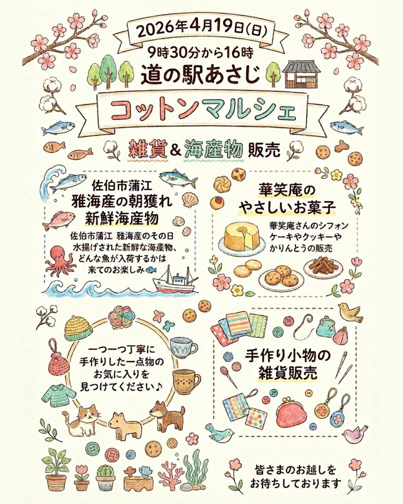 マルシェ開催!雑貨&お菓子&海産物販売 4月19日(日) 公開済み: 2026年4月11日更新: 2026年4月11日作成者: Masajiカテゴリー: お知らせ, ブログ 【マルシェのお知らせ- ̗̀】 4/19(日)は毎月恒例のコットン・マルシェ 道の駅あさじにて9:30-16:00まで開催します (雨天決行) ハンドメイド作家さんたちの雑貨販売 海産物の販売 手作りお菓子の販売 道の駅でのお買い物も、 マルシェでのお買い物も、 ぜひ楽しんでいかれてくださいね 【コットン・マルシェ】雨天決行 場所:道の駅あさじ 日時:4月19日(日) 9:30-16:00 タグ:イベント, コットン・マルシェ, ハンドメイド, マルシェ, 大分県, 手作りお菓子, 朝地町, 海産物, 産直, 豊後大野市, 道の駅あさじ, 雑貨 関連記事 10 【道の駅かまえ 交流商品】いわし、あじの丸干し、あじみりんなど […] 公開済み: 2026年3月10日更新: 2026年3月12日作成者: Masajiカテゴリー: お知らせ, ブログ, 特産品紹介 一度食べたらクセになる【かんぴょう巻きずし】 […] 公開済み: 2026年2月12日更新: 2026年2月14日作成者: Masajiカテゴリー: お知らせ, ブログ 豊後大野加工品フェアのお知らせ […] 公開済み: 2021年1月27日更新: 2021年1月28日作成者: Masajiカテゴリー: お知らせ, ブログ